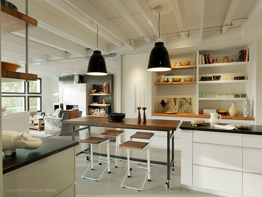 So, what’s with all that snow? The thick covering in the exterior shots was an intentional solution to hide unfinished landscaping. Despite the cold (minus five degrees Fahrenheit!), fresh snow and a pristine backdrop often result in some of my favorite photos. Here, it shows the home in one of its truest settings (it sits on a steep slope). When side-by-side with the interior photos, it proves the warmth of the design in even the coldest months.